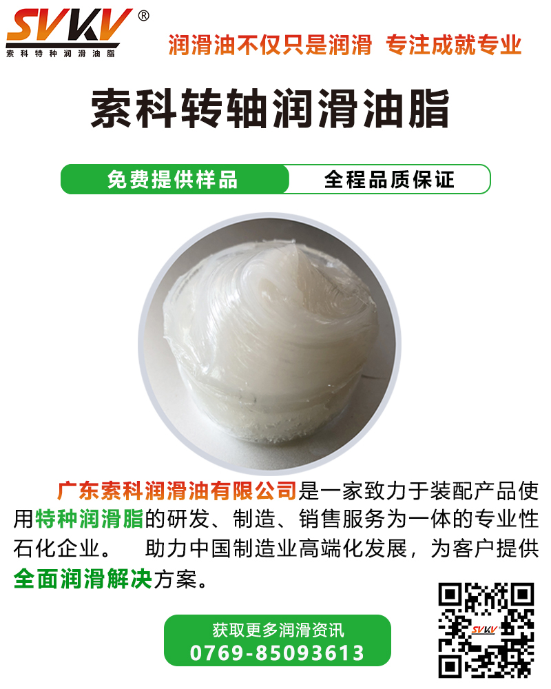 廣東索科潤滑油有限公司是一家致力于裝配產品使用特種潤滑脂的研發、生產、定制、服務為一體的專業性石化企業。致力為制造業客戶,提供專業的選油方案,協助客戶解決產品裝配時的潤滑難題,還可根據客戶特殊需求訂做適合的潤滑油品。有效提高產品性能、減低維護成本,索科助力制造業高端化發展! 主要產品有: 齒輪消音潤滑脂|高溫潤滑脂|食品級潤滑脂|齒輪消音潤滑脂|防水潤滑脂 導電油脂|軸承油|硅油|干性皮膜潤滑劑|低溫潤滑脂|阻尼脂|全氟油脂